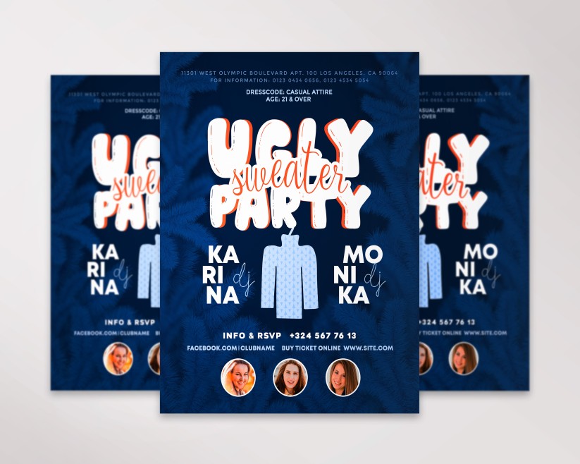 Invite everyone to show off their ugly yet adorable Xmas sweaters! Light-hearted style of this free sample seems perfect for the festive occasion. White text glowing against the navy blue will make your flyers cool and welcoming.
